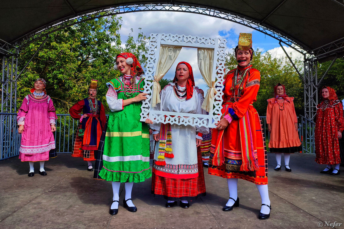 Однажды в выходные около дворца Алексея Михайловича устроили такой вот интерактив. Сначала пели песни, потом рассказывали сказку, а затем все вместе водили хороводы и плясали. Удивительно, как народ активно включается в такие движухи. Тетушки одеты в старинные костюмы Белгородской области. Обратите внимание, наряды очень разные. Это зависит от возраста женщины и ее социального статуса, а также от местности проживания. Условно можно выделить несколько регионов: Курский, Оскольский, Воронежский и Ровеньский. В некоторых случаях это просто юбка, иногда внизу по подолу пришивали широкую оборку, а если позволял достаток, ленты в несколько рядов. На переднем плане тетушка в красной клетчатой юбке, скорей всего это костюм, который носили в селах Губкинского района. А широкое платье в цветочек плюс платок говорит о том, что женщина замужем и у нее уже несколько детей. Молодые девушки одевались в яркие сарафаны. Чем старше становилась женщина, тем более приглушенными становились цвета. К старос