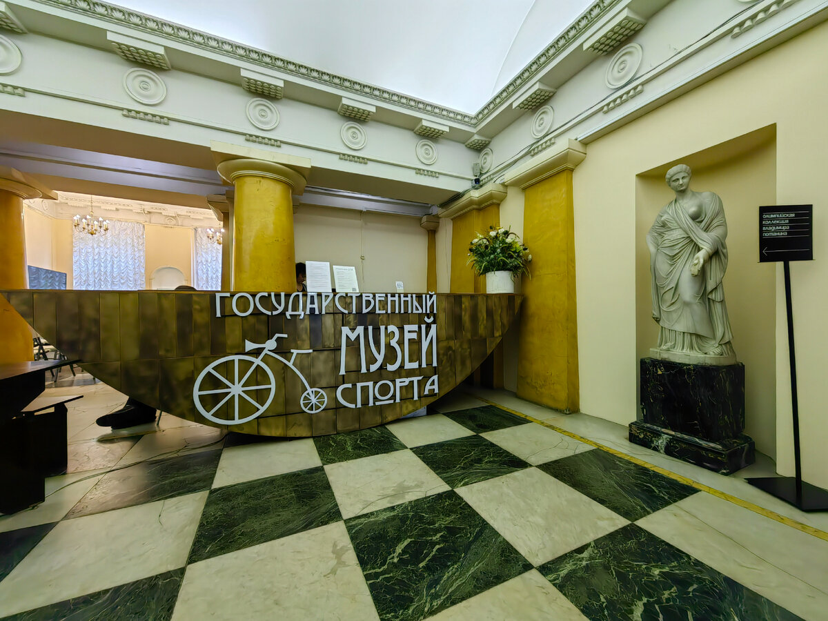 Относительно недавно в Петербурге открылся музей спорта. Он разместился в Доме князя С.С. Абамелек-Лазарева. Несмотря на то, что спорт у нас является одним из массовых зрелищ, в музее не было ни единой души. Такой вот парадокс. А посмотреть там есть на что. Как любителям спортивных соревнований так и ценителям архитектуры. Вход в музей осуществляется с набережной реки Мойки. После покупки билета (только в электронном виде по QR-коду) надо подняться на второй этаж по этой прекрасной лестнице. Вдоль неё размещены старые советские фотографии, на которых в основном показывают как тренируются спортсмены. Также есть кадры военных лет. Вход в музей украшает копия "Золотого мяча", оригинал которого был подарен знаменитому советскому вратарю Льву Яшину как лучшему футболисту Европы 1963 года. Далее вы попадаете в зал, где рассказывается об истории зарождения российского спорта с дореволюционного времени до наших дней. Дизайн экспозиции мне очень понравился! Вы двигаетесь по ленте времени, на к
