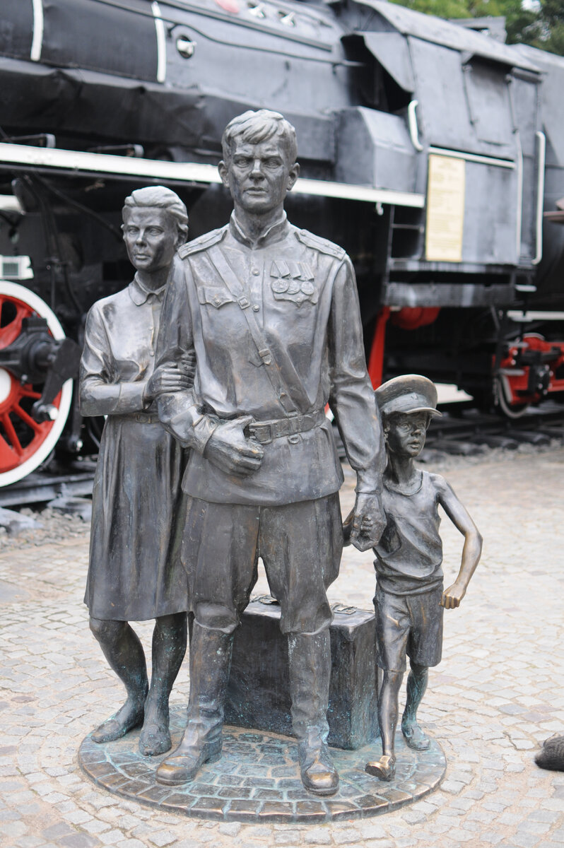 Когда мы прибыли на автовокзал города, то не обнаружили на ближайших улицах брусчатку, но как выяснилось позже, её нет по большей степени лишь в районе автовокзала. Сначала мы увидели монумент первым переселенцам, подле другого памятника паровозу Тэ-7336. Сделали несколько фотографий и отправились в город.