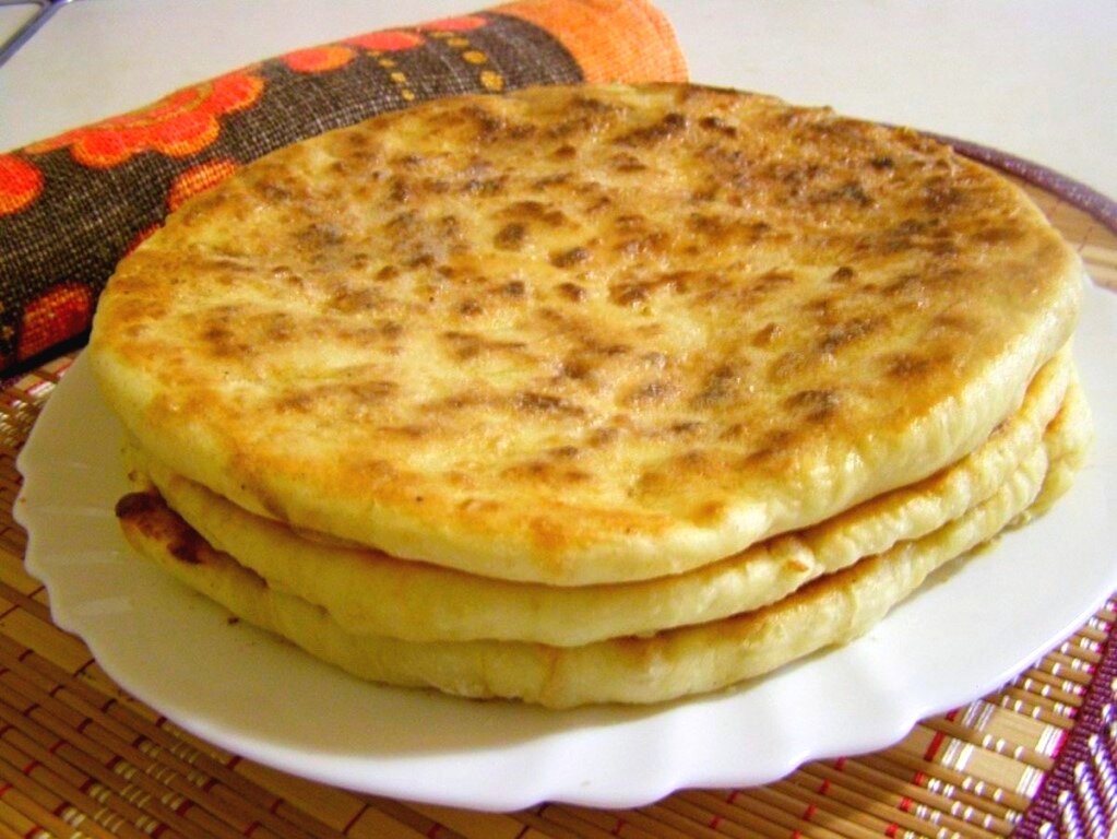 В середину лепешки выкладываем шарик сыра. Защипываем края лепешки, формируем шар, который потом аккуратно раскатываем. Обжариваем с двух сторон на сухой сковороде, а потом смазываем их кусочком сливочного масла.