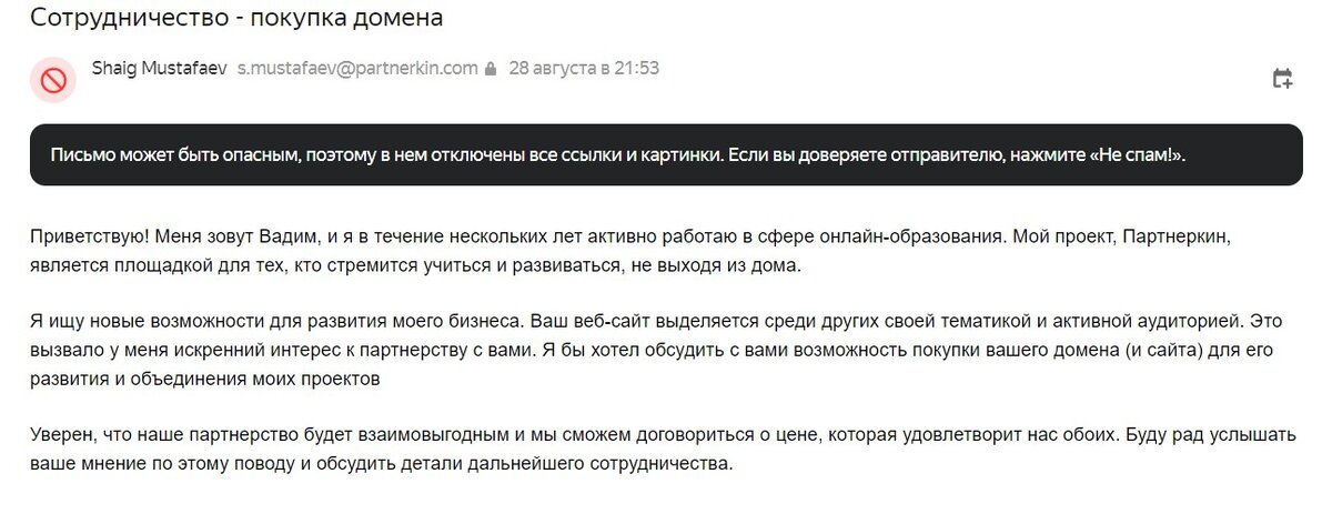 Этот пост для меня является своеобразным криком души. Я ненавижу спам и спамеров и при том чрезмерно навязчивых. Именно потому стараюсь не просто посылать их лесом молча, с помощью игнора, или просто написав сообщение в ответ. Дело в том, что около года назад я завела сайт. Он примерно той же тематики, что и мой этот вот блог. Пишу обзоры, делаю выводы. Я пишу статьи и обзоры там либо самостоятельно, либо иногда заказываю на биржах (когда обновить бы надо, а писать дико лень). Недавно же мне массово начали приходить сообщения с предложением покупки моего сайта и при том содержания этих писем практически идентичны. Видно, что автор писаем один, меняются только некоторые слова и то местами. Их игнорировала и довольно продолжительное время, но вот до товарищей не доходит и на почту сайта все продолжают приходить письма с предложением покупки. Интересно, а с чего вообще спамеры решили, что я хочу что-то продать?! И вот недавно пришло письмо-клон и пришло оно не анонимно, а с почты s.mustaf