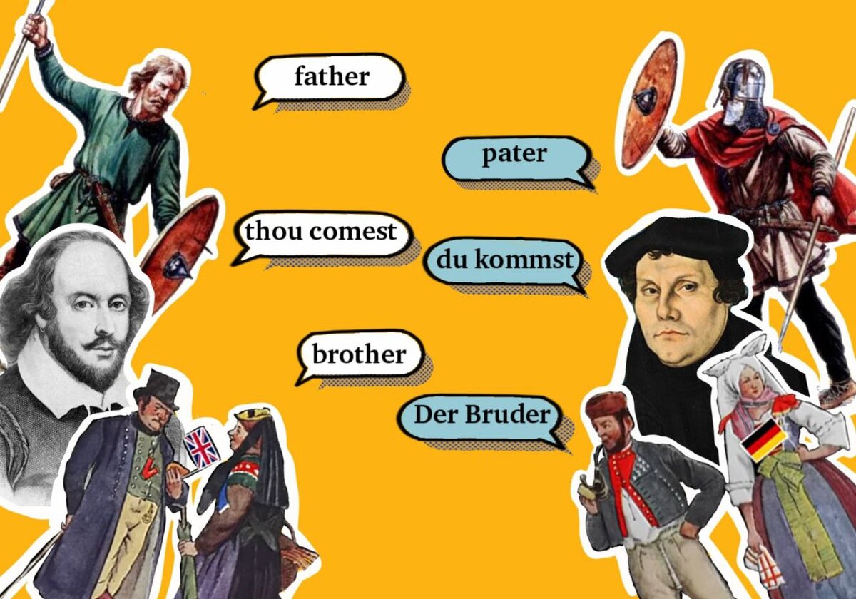 Люди, изучающие несколько языков, в частности английский и немецкий, не раз сталкивались с тем, что очень много слов поразительно похожи друг на друга. Сходство можно заметить даже в самых распространённых фамилиях в этих странах. Языки имеют схожее построение предложений, но в целом очень сильно различаются по звучанию и написанию. Как же так получилось? Дело в том, что эти языки ( а так же скандинавские) относятся к одной и той же языковой группе германских языков. Германцы поселились на территории Европы ещё до нашей эры, а по языку были близки к славянам, кельтам и римлянам. Впоследствии развились самостоятельные языки. Сейчас их можно разделить на две группы: западную ( немецкий, английский, шотландский, швейцарский) и северную ( исландский, норвежский, шведский, датский). Так же откололась восточная группа, но речь в этот раз не о них. Что же до территории современной Британии, там жило малочисленное население: римляне и кельты. В 400 годах нашей эры на неё перебираются пл