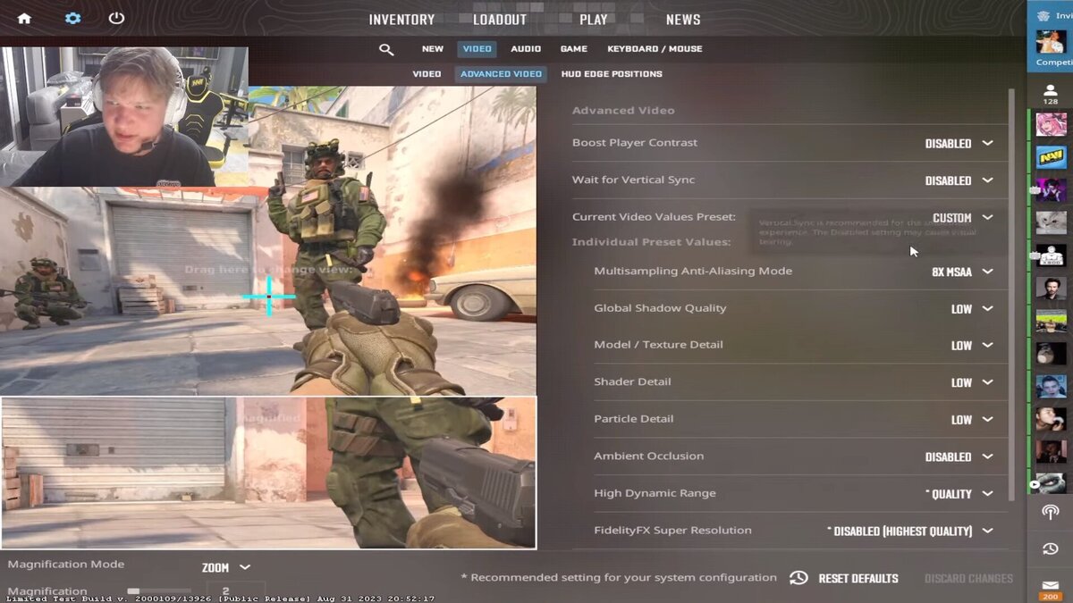 Настройки Симпла в CS 2: почти все на минимальных, играет в 300 FPS