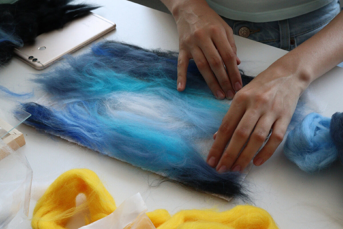 Эта картина была создана в прошлом году на творческих курсах, оплаченных по Пушкинской карте. Тема космоса, как оказалось, довольно проста в реализации в этой технике, потому что это - моя первая работа шерстью. Суть процесса проста - от мотка шерсти отрываются клочки и выкладываются на картон, обитый влажной салфеткой (для сцепления с шерстью). Ниже я представляю вам этапы создания на фотографиях, начиная с фона, заканчивая передним планом. Добавляются космическая пыль и звезды: В конце лишние края шерсти за пределами холста отрезаются, и картина ставится в рамку: Вот такие получились планеты, вращающиеся вокруг далёкого света из центра галактики.