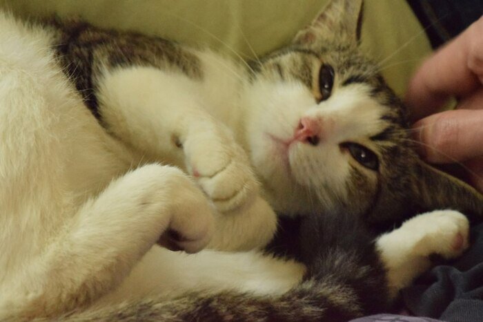 Найдена домашняя кошка. Локация и время: Ориентировачно с начала Августа проживала под кустом по адресу г.СПБ Красносельский р-н, д 35 к2. Описание: Девочка. Серо-полосатый верх, белый низ. Имеется пятнышко на носике. (Вроде не отстирывается, значит своё.) На ней был одет серый пластиковый ошейник. Не уверен, для чего такие продают, но по мне похож на ароматические, которые надеваются от блох или для успокоения животного. Состояние: Состояние у кошки неплохое, были блошки - вывели. Ориентировочно, ей 1 - 2 года. Ветеринар сказал повременить с превивкой недельку на случай инкубационного периода заболевания. Превивка от всех кошачьих болячек будет поставлена 06.09. На текущий момент никаких симптомов, кроме застрессованности, выраженной в малоподвижности не проявляет. Момент с кастрацией неизвестен, требуется рентген для установления истины. Характер: Сама по себе довольно ласковая, гладиться дается. К другим животным относится спокойно, если к ней не проявляется агрессия. Первую ночь не