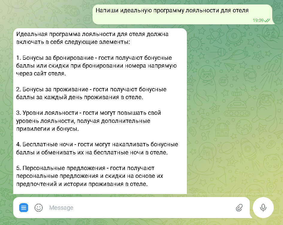 Есть тут кто-нибудь, кто боится искусственного интеллекта? Я нет. Напротив, я предлагаю быть в самом центре восстания машин! Спросил как-то у GPT про идеальную программу лояльности в отеле. Получил вот такой ответ Ну а для вас? Какой была бы идеальная программа лояльности в отеле? Что нужно, чтобы принять решение возвращаться в один и тот же отель снова и снова?