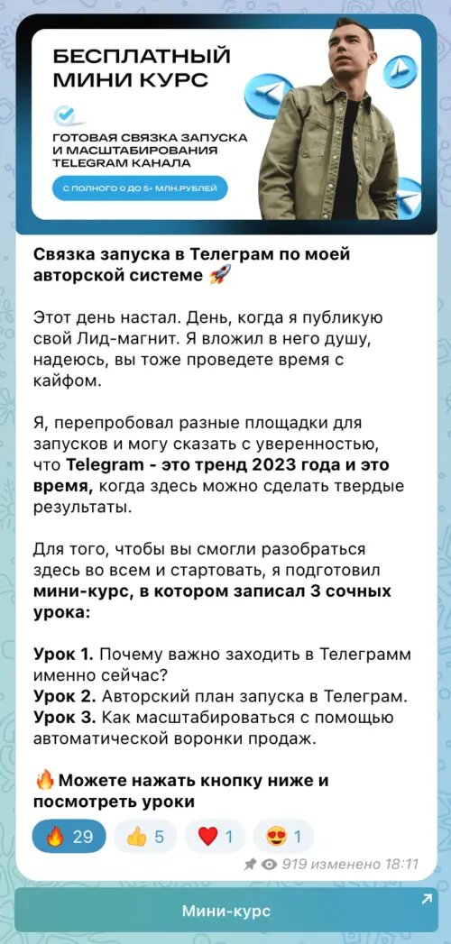 Далее идет еще 5 шагов успешного запуска. Чтобы ознакомиться со всеми шагами, переходи в мой канал, там в закрепе есть классный бесплатный мини-курс из 3 уроков “Готовая связка запуска в Телеграм на 1+ млн.рублей”. Переходи, ЖМИ