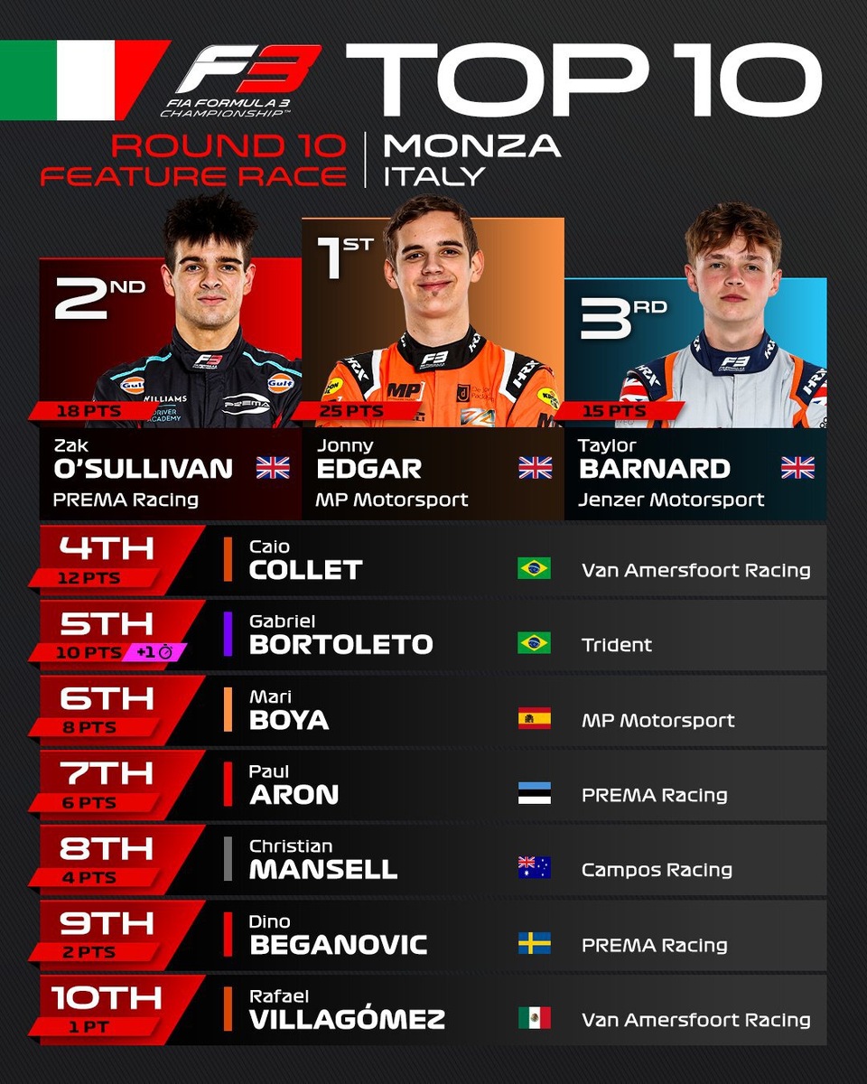 Гонщик «МП Моторспорт» Джонни Эдгар выиграл основной заезд «Формулы-3» в Монце – заключительную гонку сезона-2023. Эдгар боролся за победу с пилотом «Премы» Зак О’Салливаном и сумел сдержать соперника на последнем рестарте. Третье место на заключительном круге вырвал представитель «Йенцера» Тейлор Барнард в сражении с Кайо Коллетом («Ван Амерсфорт»), пятым финишировал новый чемпион Габриэль Бортолето из «Трайдента». Заезд неоднократно прерывался авариями и выездами машины безопасности. Сошли девять пилотов, в том числе Никита Бедрин из «Йенцера», победитель спринта Франко Колапинто («МП Моторспорт») и Пепе Марти («Кампос»). Подиум О’Салливана и неудачи соперников позволили Заку опередить Пауля Арона («Према»), Колапинто и Марти в борьбе за вице-чемпионство. По итогам сезона Бортолето набрал 164 очка, О’Салливан – 119, Арон – 112, Колапинто – 110, Марти – 105. Бедрин завершил сезон на 18-й строчке с 24 баллами. Бортолето стал чемпионом «Формулы-3» Формула-3. Италия. Колапинто выиграл 1-
