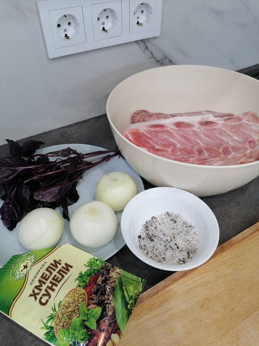 -растительное масло. Итак, лук нарезаем на полукольца. К нему отправляем нарезанный базилик, немного солим и хорошо перемешиваем. Далее режем корейку на куски. Солим, перчим, добавляем хмели-сунели и кориандр. Антрекоты смазываем небольшим количеством растительного масла. Берём глубокую миску и укладываем в неё слоями: лук /базилик - мясо - лук /базилик - мясо. Убираем мариноваться в холодильник минимум на 3 часа, лучше - на ночь. Жарим на шампурах до готовности. Приятного аппетита!