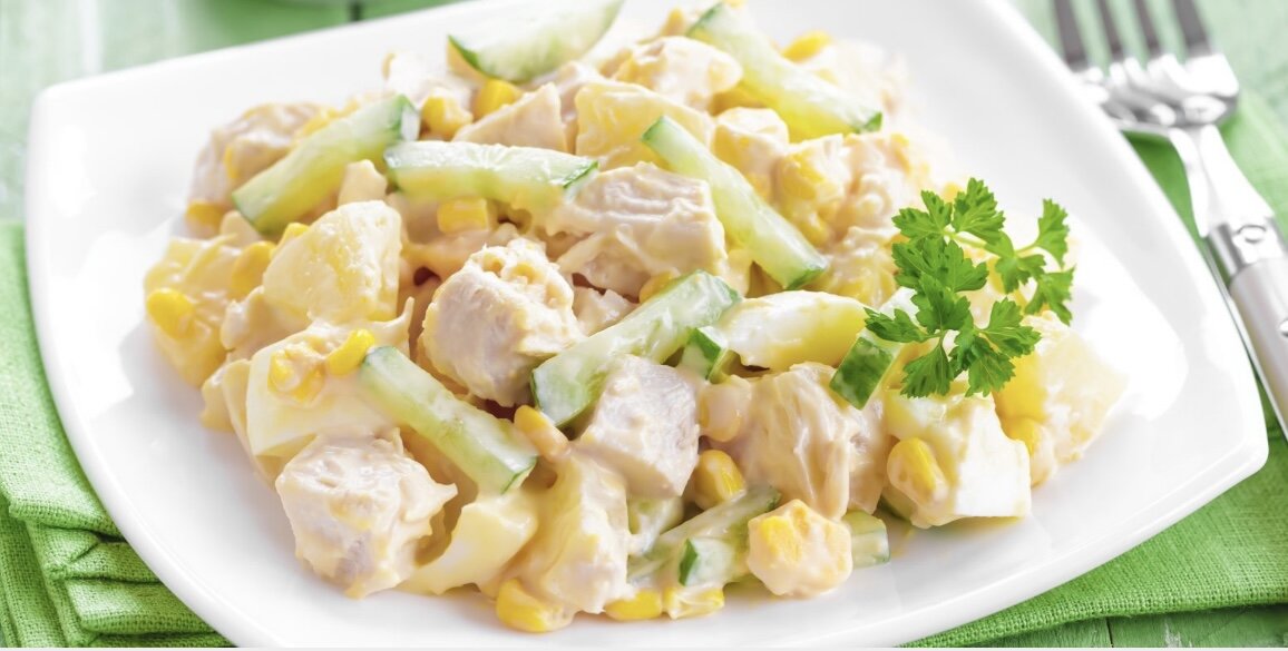 Салат с ананасом, копчёной курицей, кукурузой и огурцом.