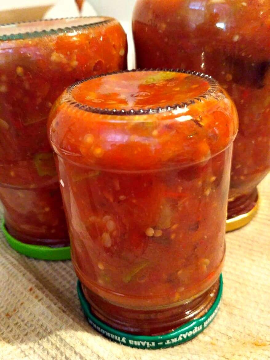 * Восемь крупных помидор, головка чеснока, один горький перец, прокрутить на мясорубке. Отставить. 3 морковки нарезать соломкой. Три репчатые луковицы нашинковать полукольцами. Два баклажана и два кабачка нарезать брусочками. Обжарить овощи на растительном масле, в два захода. Посолить. Соединить подготовленные овощи и помидорную массу. Добавить соль, хмели сунели, сахар. Тушить на небольшом огне, около 30 минут. Разложить по банкам. Закрыть и перевернуть банки, до полного остывания.