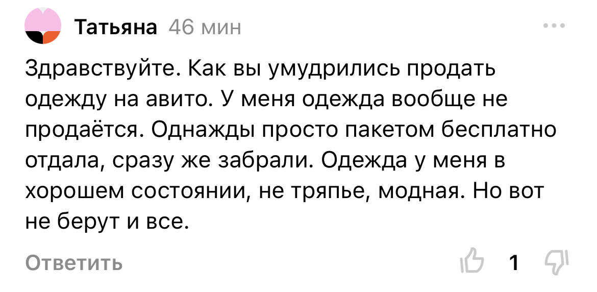 Всем Привет! Отвечу сегодня на комментарий Татьяны, как удаётся продать одежду. Часто в комментариях пишут зрители, что не удаётся продать вещи, а одежду вообще очень сложно. У меня опыт продаж ненужного не такой большой, начала активно этим заниматься с ноября прошлого года. Что для себя поняла, что важно регулярно публиковать новые объявления. В идеале каждый день. Не всегда мне это хочется, но примерно через 1-2 дня стараюсь это делать. И вижу, что спроса тогда больше. Сначала я одежду не продавала, так как начиталась, что совсем не продаётся и легче ее выбросить-отдать. Раньше отдавала одежду своим близким, но так как живут далеко от меня, то возможности нет передать, решила попробовать все таки продать. Отдавать бесплатно незнакомым не хочу, так как начиталась, что не ценят люди бесплатное, один из примеров: берут нормальные вещи, один раз надевают и на мусорку, чтобы не стирать. Когда формировала первое объявление с одеждой, то поставила небольшую сумму, примерно 70 рублей за