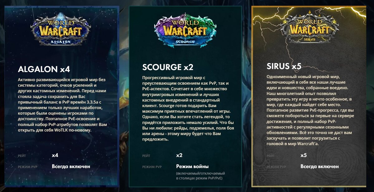 Первое, что видит новичок заходя в игру - это предложение выбрать сервер для игры. В WOW Sirus есть три сервера: ALGALON x4, SCOURGE x2 и SIRUS x5, карты на этих серверах похожи, но есть отличия в виде событий и прокачки персонажа, об этом сегодня и поговорим. Основные различия SCOURGE x2 - самый старый сервер и является «площадкой для испытания» нового контента, поэтому на нем раньше всех появляется новый контент (рейды, экипировка, камни, чарки и тп). На данный момент контент 297-303 илвла (уровня предметов). ALGALON x4 - «дефолтный лич», сервер имеет минимальный порог вхождения. На данный момент контент там на 277 илвл. SIRUS x5 - «самый сок» со всеми лучшими фишками Сируса, он похож на х2, но боссы имеет увеличенное кол-во здоровья, порезанные камни (в дальнейшем вроде как это все апнется в нормальное состояние). На данный момент контент 260 илвл. Система категорий На 80 уровне у персонажей появляется система категорий (категории дают очки усиления которые можно вкладывать в хар