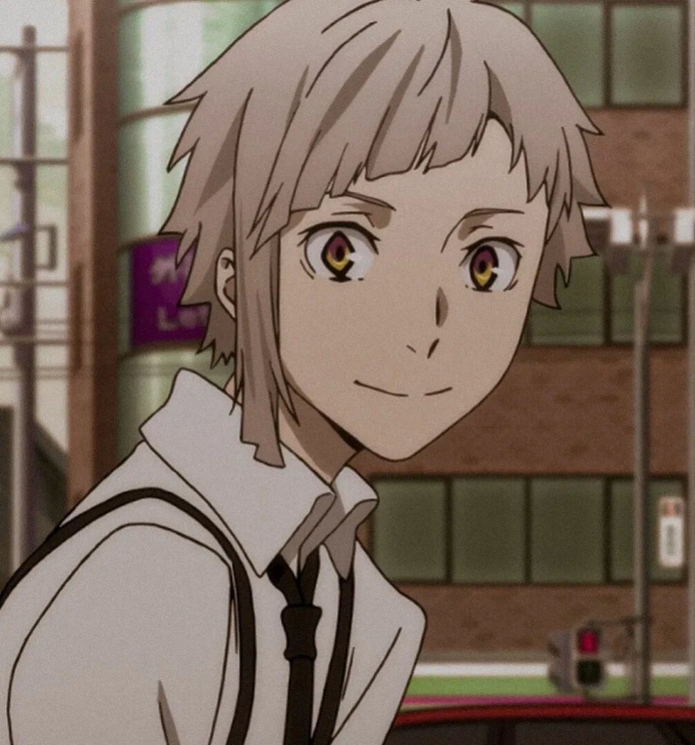 Ацуши Накаджима - главный герой из бродячих псов Внешность:У Ацуши серебристые волосы, бледная кожа и жёлтые с фиолетовым оттенком глаза. У него короткие волосы на правой стороне лица и длинные с левой стороны с заметной чёрной полосой. Он среднего роста и худощавого телосложения. В начале он носил одежду из приюта: серые кофту и штаны, чёрные туфли-лодочки. После вступления в Вооружённое детективное агентство он стал носить белую рубашку с рукавами по локоть, чёрный галстук, чёрные штаны, ботинки, перчатки без пальцев, подтяжки и ремень, комбинированный с длинным поясом, болтающимся свободно от пряжки. Когда он частично превращается в тигра, его глаза становятся похожими на тигровый глаз, и у него появляются полоски тигра.. Если полностью, то его конечности превращаются в конечности тигра, и появляется хвост. Личность: Из-за жестокого обращения в приюте, Ацуши совсем не уверен в себе, и даже ненавидит себя. Он зациклен на прошлом, и на протяжении истории принимал множество неправильны