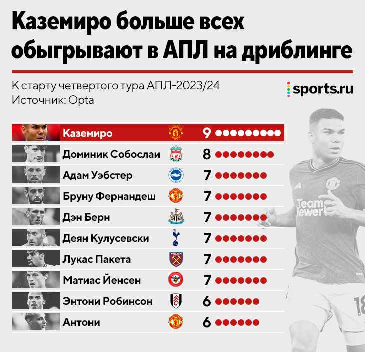 Антилидерство Каземиро по количеству обыгрышей на дриблинге – одна из главных тем на старте АПЛ. После второго тура на проблему обращал внимание Джейми Каррагер в эфире Monday Night Football на Sky Sports. К четвертому ситуация изменилась не сильно: Каземиро обвели уже девять раз – больше любого другого игрока в АПЛ.