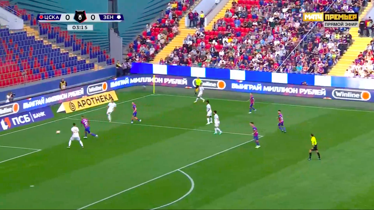 ЦСКА повел очень быстро. Вот это начало топ-матча! «Зенит» на четвертой минуте подарил ЦСКА шанс, Антон Заболотный воспользовался. Пожар начался с паса Нуралы Алипа от края штрафной вратарю – уже тут выглядит опасно. Антон Заболотный сразу рванул на Михаила Кержакова, чтобы давить. Вратарь завозился, а форвард влетел и в подкате выбил у него мяч прямо в ворота. Чьей вины больше: Алипа, что подставил вратаря, или Кержакова, что стал обрабатывать во вратарской и в створе, а не просто выбил? «Соперник прессинговал и воспользовался нашей ошибкой, пропустили ненужный гол», – сказал в перерыве Нуралы Алип. А на прямой вопрос о том, что произошло в эпизоде, ответил, что не знает. Ну и, конечно же, хвалим Антона Заболотного – не зря пошел в прессинг и принес ЦСКА важное преимущество в самом начале. У Антона результативное действие в четвертой игре РПЛ подряд, до этого был ассист с «Оренбургом» и по голу «Динамо» с «Сочи».