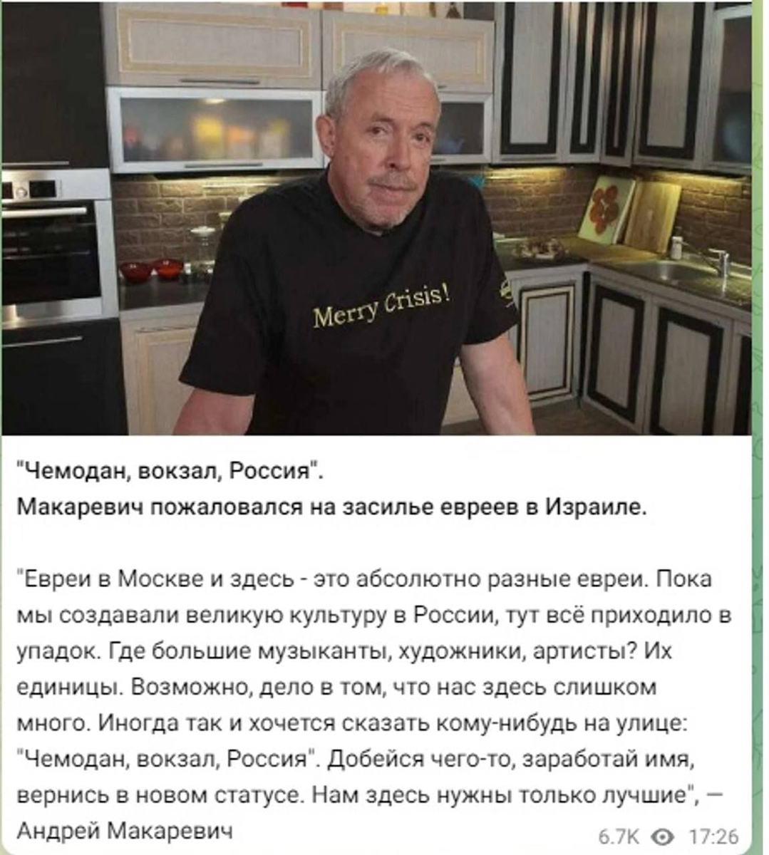 Что за невезуха, да? Ну куда человек ни поедет, везде не тот народ! И в Москве ему было не очень, и в России не так, и вот теперь в Израиле евреи не соответствуют высокой планке Андрея Вадимовича. Все-таки "они" создавали великую культуру в России, а в Израиле в это время все приходило в упадок, понимаете? И не надо хихикать! Скажите спасибо, что Макаревич употребил местоимение "мы", а не скромно признался в своих заслугах. Ну типа Лены Миро, понимаете? "Я пишу лучше всех в России, меня знают все, после моих публикаций снимают губернаторов" - и привет. И Андрей Вадимович мог бы так же сказать, но врожденная скромность не позволяет ему выдавать людям правду в таких количествах. Поэтому он и употребил слово "мы". И его чрезвычайно огорчает, что на святой земле его предков проживают люди, недостойные высокого звания приличного человека. Они там просто так живут вместо того, чтобы кровью и потом добиваться этого права. У них нет выдающихся заслуг! А это несправедливо, ибо Андрею Вадимови