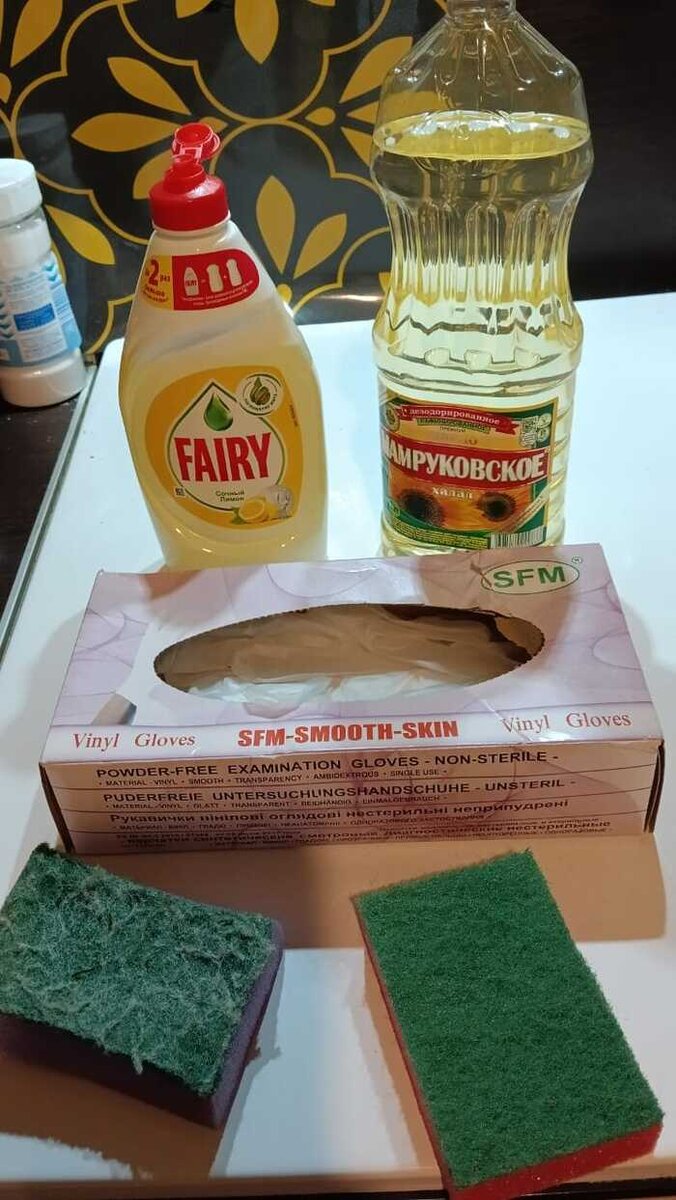 Нам понадобится: Старая губка для мытья посуды (готовая на выброс) 2. Растительное масло (любое, кол-во зависит от степени загрязнения решетки и её площади, у меня решетка одна на всю вытяжку и небольшая, хватает 50-70 мл. масла). Средство для мытья посуды, которое вы используете. Перчатки любые (опционально, но я использую). Итак, мы сняли грязную решетку и находим удобное место для чистки. В моём случае, из-за скромного размера решетки, она свободно помешается в кухонную раковину, если же у вас она не помещается – можно проделать процедуру очистки в ванне, например, или в каком-либо подходящем по размеру тазу, если такой у вас имеется в хозяйстве. Если проводим процедуру в раковине или в ванне, желательно закрыть слив сеточкой, собирающей крупные частицы грязи. Не смачивая водой вытяжку, надеваем резиновые перчатки (это, конечно, не обязательно) и наливаем на старую губку масло, так, чтоб губка впитала в себя достаточное его количество. Затем начинаем чистку с грязной лицевой стор