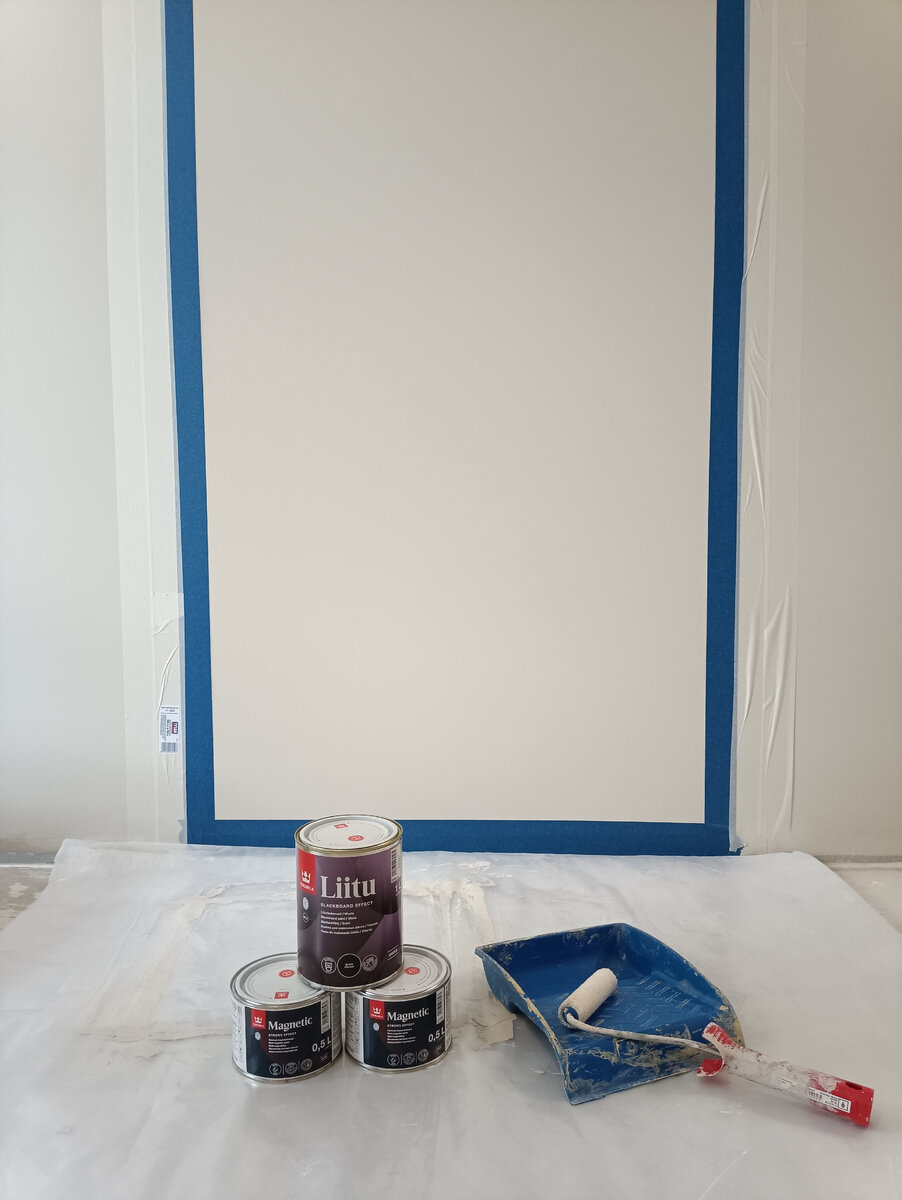 Укрываем все кроме будущей магнитно-грифельной доски и красим все по два слоя. Магнитную краску нужно долго и тщательно перемешивать и в процессе нанесения остатки периодически мешать. Нанесенную магнитную краску выравниваю широким шпателем. Далее аналогично наношу второй слой.