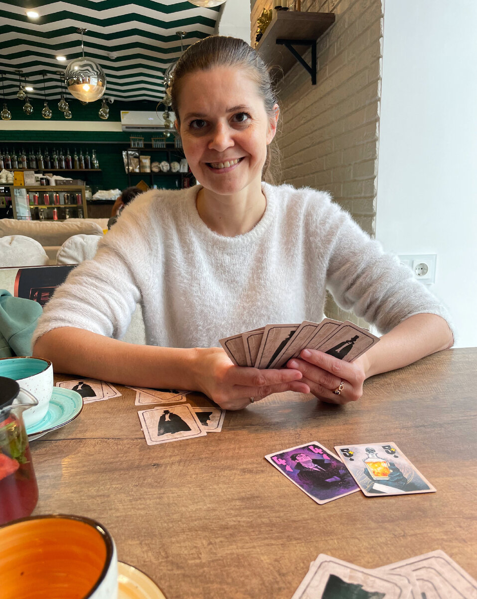Я редко играю в дуэльки не онлайн — и сегодня внезапно представилась такая прекрасная возможность, и мы с Дашей две партии подряд сыграли в «Джекила против Хайда». Я одно время активно играла в неё онлайн — и, сыграв уже офлайн, так и думаю, что это одна из самых необычных дуэлек, ещё и с интересной темой. Ещё в университете я читала Стивенсона, и, конечно, история доктора Джекила и яркий образ Хайда произвели на меня неизгладимое впечатление. Мне нравится, что игра имитирует подвижность сознания в голове Джекила — Хайд со всеми пороками пытается качнуть качели разума и показать свою сущность со всеми вытекающими: по факту игроки участвуют в перетягивании каната. Дойдёт фишка до клетки Хайда — он вырвется в реальный мир, а если за три раунда не успеет, то Джекил смог взять себя в руки и не выпустил Хайда наружу. Ещё мне нравится, что цель Хайда в игре — это перекосы и крайности. Игровой процесс построен на механике «взяток» — и Хайду (и участнику, который играет за него) нужно, чтобы р