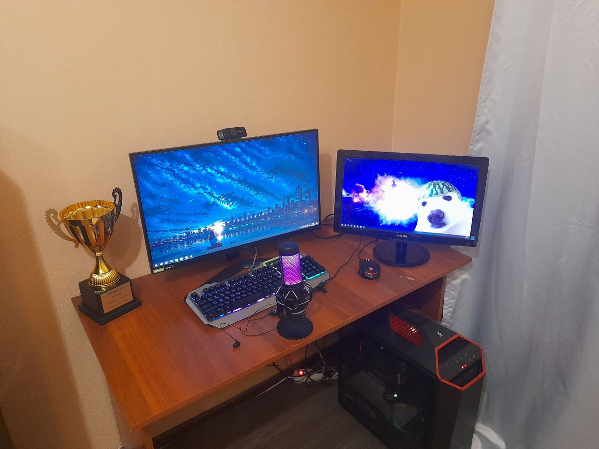 Так как я совсем недавно переехал, мой уголок похож на обычный уголок обычного человека за исключением наверное кубка за победу в турнире по героям 3. Еще пока не успел всё нормально оборудовать. В планах добавить свет, фон, взять нормальный второй монитор под чат и в обязательном порядке удобный стул.
