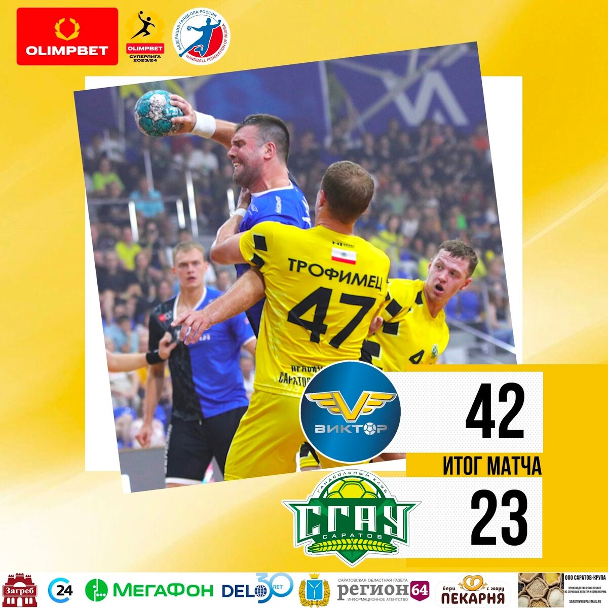 Ставропольцы учинили разгром волжанам, но оценку их уровня стоит отложить — уж больно непрезентабельно выглядели гости. Подробнее — в обзоре БЦ! Мужчины. Olimpbet Суперлига 3.09. Виктор (Ставрополь) — СГАУ-Саратов — 42:23 (20:11) Судьи: Будагов, Ханмагомедов. Виктор: Заболотский (10/26=38%), Третынко (5/12=41%); Болотин (2/3), Мазуров (2/2), Некрасов (4/5), Ильтинский (10/10), Афлитулин (5/6), Беляев (4/6), Харитонов (3/3), Максимов (1/1), Лукинов (1/1), Пасенов (3/4), Булкин (1/2), Гроцкий (1/3), Врачевич (3/3), Д.Филиппов (2/3). СГАУ-Саратов: Мартыненко (1/12=8%), Сергеев (6/26=23%), Никабадзе (0/10=0%); Салимов (2/6), А.Филиппов (0/1), Филимоненко (1/2), Мусаев (1/3), Овчинников (2/6), Гончаренко (1/1), Рыжков (1/4), Измайлов, Добрынин (4/4), Трофимец (3/5), Шишков (4/7), Сазонов (3/4), Матвеев (1/2). Olimpbet Суперлига. Кто за ЦСКА, кто за Чехов? "Саратов" — в плей-офф или мимо? Прогноз на регулярку Анализируя перспективы СГАУ-"Саратова", все специалисты делали оговорку — мол, всё