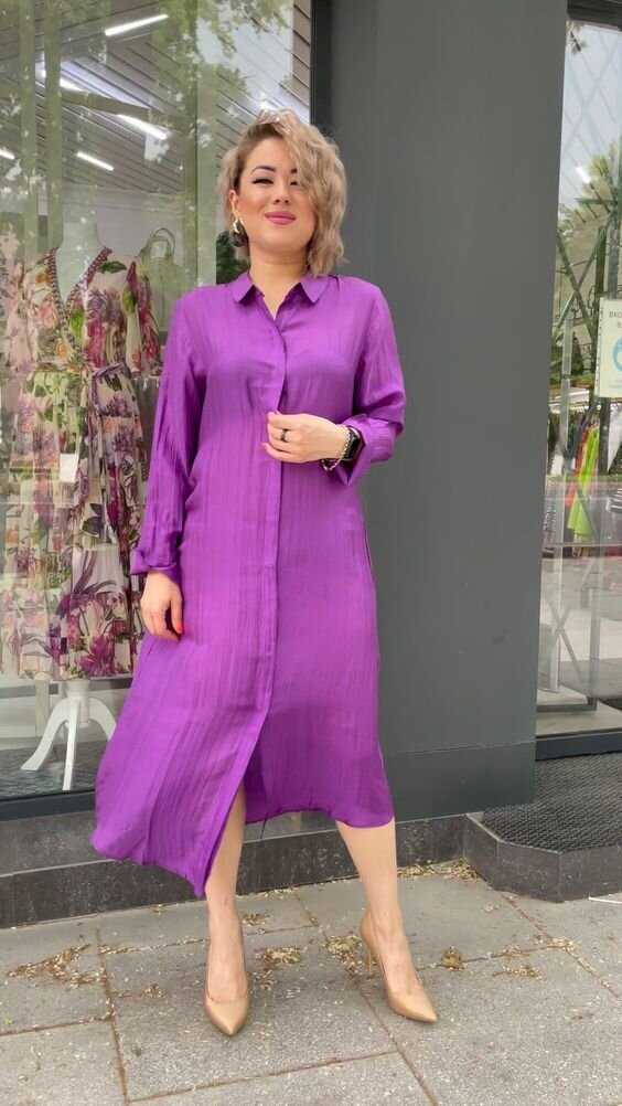 - Платье-рубашка с длинными рукавами – универсальное решение. Такая модель хорошо будет смотреться на фигуре любого типа. Модель силуэта трапеция с супатной (скрытой) застежкой. Сшито платье с ткани с крэш-эффектом, то есть его даже не нужно будет гладить. Также внимание привлекает красивый фиалковый цвет. К таком платью не требуются яркие дополнения, отлично будут смотреться нюдовые туфли или белые кеды.
