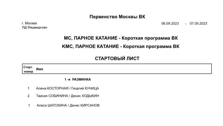 Расписание соревнований (время московское) на 07.09.2023 г. последний день соревнований. Смотрите трансляцию. *** Смотрите здесь, всего заявилось на Первенство Москвы более 200 спортсменов. *** Два дебюта (вне программы) были очень интересными. В соревнованиях спортивных пар вне конкурса выступили Алена Косторная и Георгий Куница. Их внесли в список спортивных пар. *** Фигуристка Алена Косторная в интервью Матч ТВ отметила, что они с Георгием Куницей уже выполняют полный набор элементов в короткой и произвольной программах в парном катании. Напомню, что Косторная - чемпионка Европы в одиночном катании. В начале 2023 года фигуристка объявила о переходе из одиночного катания в парное и стала выступать с Куницей: "Мы делаем полный набор короткой и произвольной программы: два основных выброса, двойная подкрутка у нас есть, прыжки на месте, три поддержки основные, тодесы, вращения", - сказала она. *** 7 сентября, четверг, соревнования завершены. Подробные результаты и протоколы можно посм