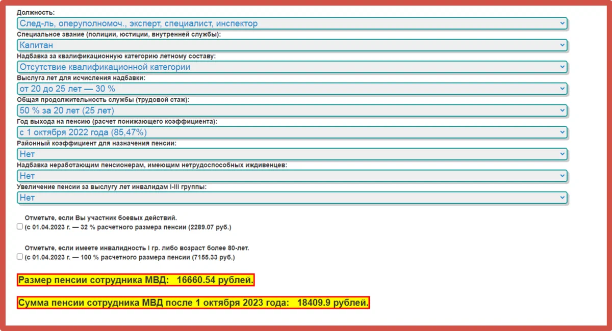 Здравствуйте, уважаемые подписчики и гости канала Военное Право! Сегодня дайджест-материал за август - самые интересные для Вас (исходя из просмотров и комментариев) материалы. От 11 315 руб. и больше... Сколько будут получать пенсионеры МВД - сержант, прапорщик, капитан, полковник после 1.10.2023 года Название говорит само за себя. Приводится расчет возможных пенсий после индексации для сотрудников МВД по определенным званиям и должностям. Вот, например, на скриншоте выше расчет пенсии для капитана полиции в должности следователя (оперуполномоченного, инспектора). Как получать военную пенсию в центре России более 60 тыс. рублей при выслуге 20 лет? Смотрите расчет! Материал о том, каким образом при проживании в регионах, не связанных с районными коэффициентами, можно увеличить свою пенсию. Вот один из основных комментариев в статье: 20 календарей, 35 льготных, 14 тарифный разряд, РК- 1.5 Пенсия 61,5 тр сейчас. Вторая пенсия есть. Служба, как в санатории на курорте. 66 лет, никогда и н