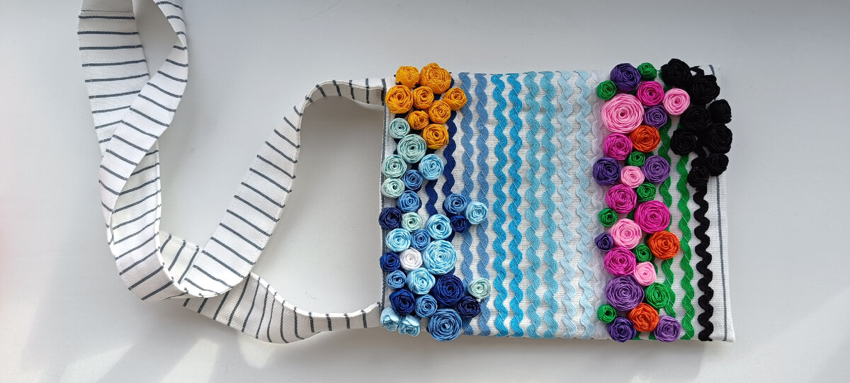 Детские пожелания к заказу всегда более точные,чем взрослые. Ребенок описывает что он хочет в мельчайших подробностях и даже нарисует.В этот раз речь шла о маленькой сумочке на длинной ручке.первое что я услышала это была фраза:"Полосатую с цветами" Рисунок ребенка прилагался) Полотенце (в составе 100процентов хлопок)и тесьма зигзаг, её ещё называют вьюнчик, вьюнок. Сначала сшила обычную сумочку на подкладке из хлопка( полоски присутствуют ),по лицевой стороне нашила полоски тесьмы таким образом располагая цвет,чтобы создать намёк на небо,лужайку. Из тесьмы накрутила круги -цветочки разного диаметра и цвета Закрепила булавками,чтобы посмотреть как будет выглядеть на ткани.Потом кончики приклеила. Приступила к сборке .Цветочки из тесьмы расположила на лицевой стороне сумочки на линиях пришитого зигзага. Пришила . Вот что в итоге получилось . Увидев результат , захотелось ещё пенал для карандашей в такой технике,смотрите в следующей статье. Всё можно сделать своими руками )