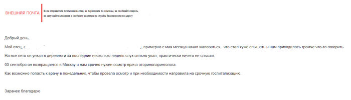 Работаю в поликлинике. Рассказываю о жалобах пациентов. Дочь пациента написала на адрес электронной почты поликлиники о необходимости срочной госпитализации своего папы (60 лет) по причине сильной потери слуха. Исходя из письма: Папа стал плохо слышать, ему приходится все выговаривать громче чем обычно. Не смотря на свое состояние, он уезжает на дачу на 3!!! с небольшим месяца, и там ему становится хуже, он почти ничего не слышит, но домой приедет планово только 3 сентября. Поэтому, ему нужна консультация оториноларинголога именно на 4 сентября, чтобы, по мнению дочери врач посмотрела папу и срочно направила на госпитализацию. По анализу амбулаторной карты, пациент обращался в поликлинику в июне, однако, только к врачу-урологу и хирургу по причине других болячек. К терапевту или врачу общей практики не записывался на прием. Но сейчас записался на прием оториноларинголога на 7 сентября самостоятельно. Дочери пациента был дан ответ, что необходимо записаться на прием врача общей практики