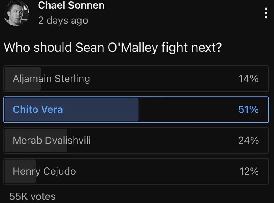 Экс-боец UFC Чейл Соннен провел опрос в соцсетях, предложив фанатам выбрать будущего соперника Шона О’Мэлли. С большим отрывом победил Марлон Вера, набравший 51% голосов. На второй позиций Мераб Двалишвили – 24%. Третьим стал Алджамейн Стерлинг, заработавший 14% голосов. А на последнем месте оказался Генри Сехудо, которого выбрали лишь 12% человек. Шон О’Мэлли отреагировал на результаты: «Ух ты, мне нужно извиниться перед Генри Сехудо. На самом деле он намного популярнее, чем я думал». Марлон Вера: «Стерлинг должен был послать UFC после победы над Сехудо. Лучше было драться в декабре» Вера раскритиковал Яна и Сехудо за желание подраться с О’Мэлли: «Гребанные киски»
