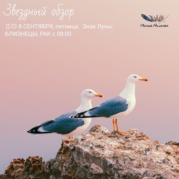 Наводки на новый день! ♊♋ 8 СЕНТЯБРЯ, пятница. Знак Луны: БЛИЗНЕЦЫ, РАК с 08:00 Тренды дня: Один из ключевых ярких дней этой недели. Аспект Солнца и Меркурия с Юпитером. Он разжигает амбиции, добавляет оптимизма тем, кто умеет использовать его яркую, воинственно-авантюрную энергию. На влиянии этих аспектов хорошо и удачно можно заниматься рекламой и саморекламой, причем без всякого ложного стыда. Успешными могут быть переговоры, где вы в полной мере покажете свои сильные стороны. Этот аспект также хорош для начала обучения и преподавания. Здесь есть ощущение счастья в этот день. И несмотря на то, что Меркурий ретрограден, тем не менее, вот здесь может приниматься очень важное, ключевое и серьёзное решение, связанное с материальным благополучием. И опять таки ретроградность и Меркурия и Юпитера предлагают нам обратить взор в свое прошлое. И извлечь из него максимум пользы в материальной, земной сфере. Луна переходит с утра в свою обитель Рака и будет окрашивать пятницу расслабленност