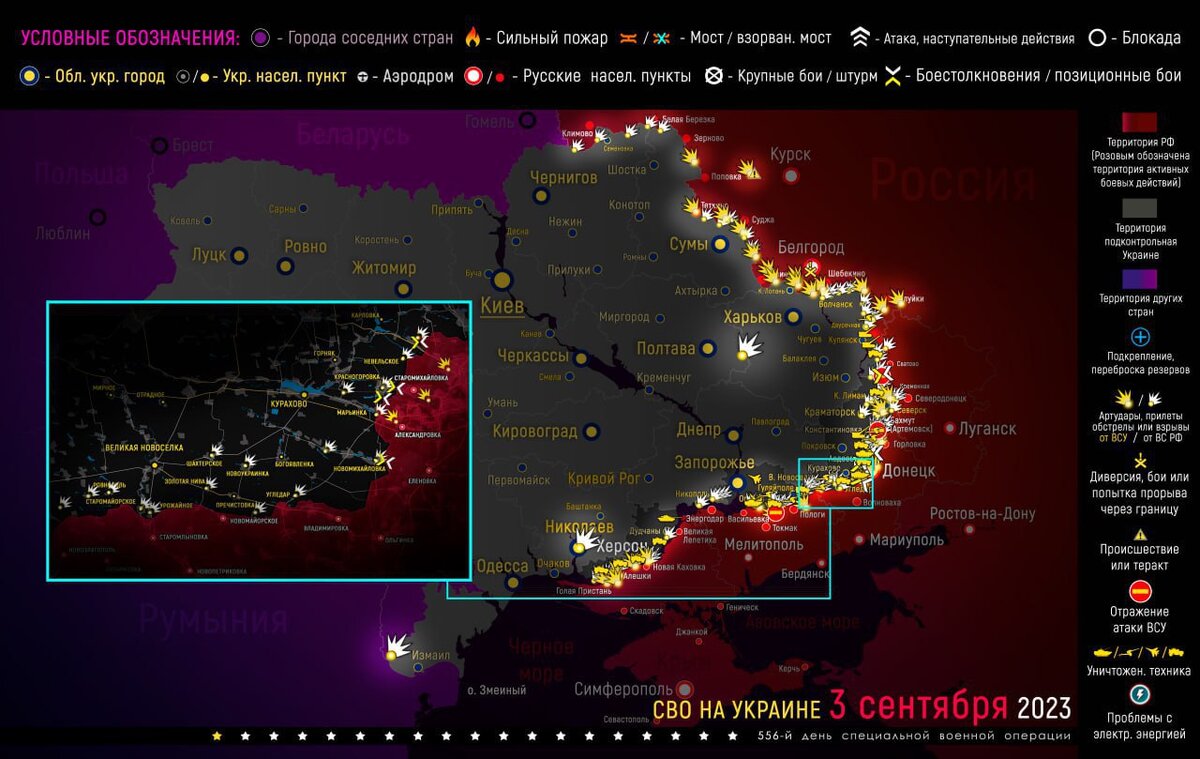 ⚔️Обстановка на фронтах за уходящие сутки: ⚫️Сватово-Кременное направление Русская армия продолжает наступать на Купянском участке. Также наши бойцы атаковали в районе Новоселовского, а также продвинулись у Новоегоровки. ⚫️Донецкое направление На Авдеевском участке возобновились встречные бои. Русская армия штурмует позиции ВСУ у Красногоровки. В Марьинке без перемен — бои на западных окраинах. Также наши успешно атаковали в районе Новомихайловки. ⚫️ Запорожское направление На Ореховском участке идут ожесточенные бои — боевики пытаются закрепиться у Работино, на южных окраинах которого наши держат оборону. Также ВСУ атакуют у Вербового, но пока без успеха.