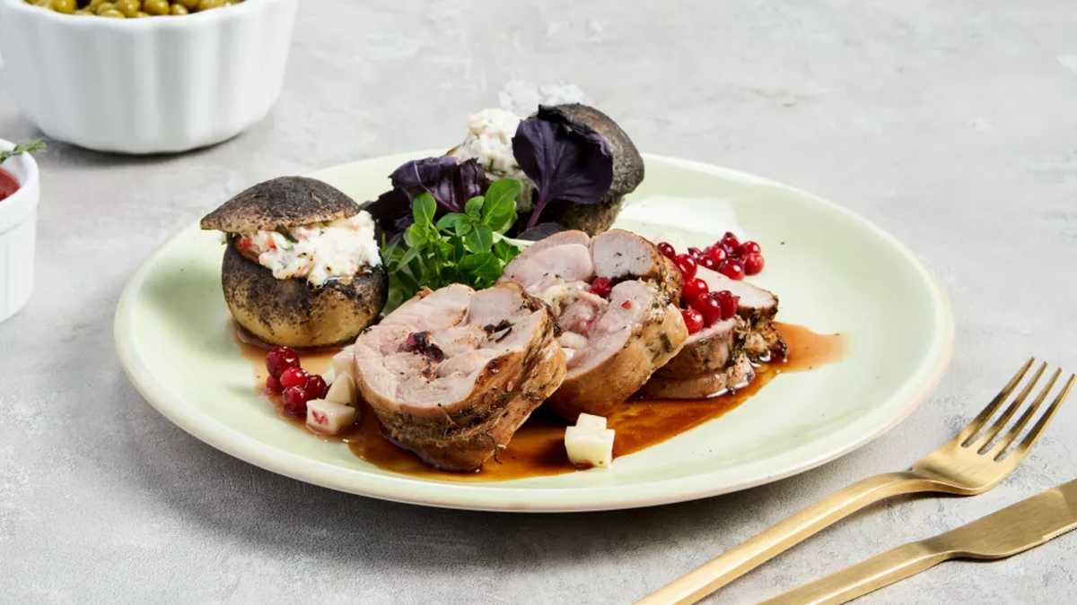 Индейка с сулугуни и брусникой — это интересное блюдо, в котором солоноватый вкус сыра отлично сочетается с кисло-сладким привкусом сочной ягоды. Сушеные травы помогают добавить индейке приятный аромат, а молотый перец — сделать ее более пикантной. Готовое блюдо получается очень сочным, питательным, а главное — вкусным. Для подачи индейки используется запеченный картофель, однако его можно заменить на рис или легкий овощной салат.