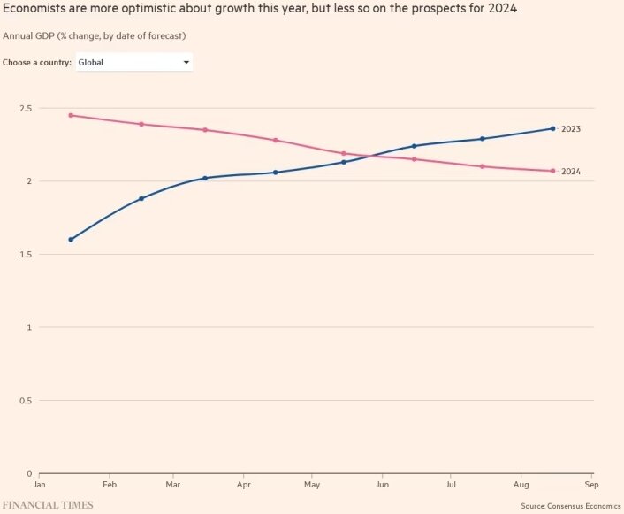 Сочетание более сильной экономики США в 2023 году и более жесткой инфляции приводит к понижению прогнозов на следующий год. Продолжительное сохранение процентных ставок на высоком уровне в крупнейших экономиках означает, что глобальный экономический рост, вероятно, замедлится в следующем году после того, как в 2023 году темпы роста превзойдут ожидания, говорят экономисты. Согласно совокупным прогнозам консалтинговой компании Consensus Economics, в 2024 году объем мирового производства вырастет на 2,1 процента, по сравнению с 2,4 процента, которые ожидается в экономике в этом году. Экономисты повысили свои ожидания относительно показателей этого года на 1 процентный пункт с начала года из-за неожиданно сильного потребительского спроса и рынков труда. Частично замедление в 2024 году будет результатом «некоторых базовых арифметических эффектов»: увеличения производства в этом году и сглаживания роста в следующем, сказал Саймон МакАдам, старший глобальный экономист Capital Economics. Однак