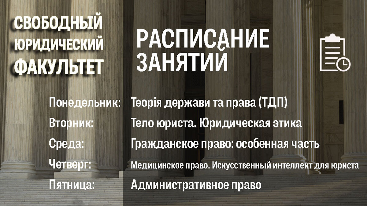 Понедельник: Мельниченко Р.Г. Теорія держави та права (ТДП) https://vk.com/theoryofgovernmentandrights2023 Вторник: Кинжибало Л.Н. Тело юриста. https://vk.com/club221140287 Готовко Ю. Юридическая этика https://vk.com/event221140263 Среда: Мельниченко Р.Г. Гражданское право: особенная часть https://vk.com/iuscivilvolgograd2023autumn Четверг: Матвейчук. Н.В. Искусственный интеллект для юриста https://vk.com/event221135802 Мовчун В.А. Медицинское право https://vk.com/club221140276 Пятница: Мельниченко Р.Г. Административное право https://vk.com/verwaltungsrecht2023