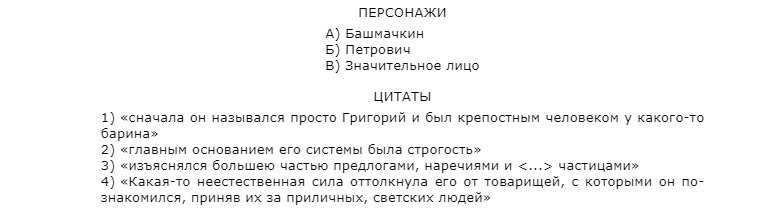 3. Установите соответствие между тремя персонажами «Шинели» и относящимися к ним цитатами. Запишите в ответ цифры, расположив их в порядке, соответствующем буквам: