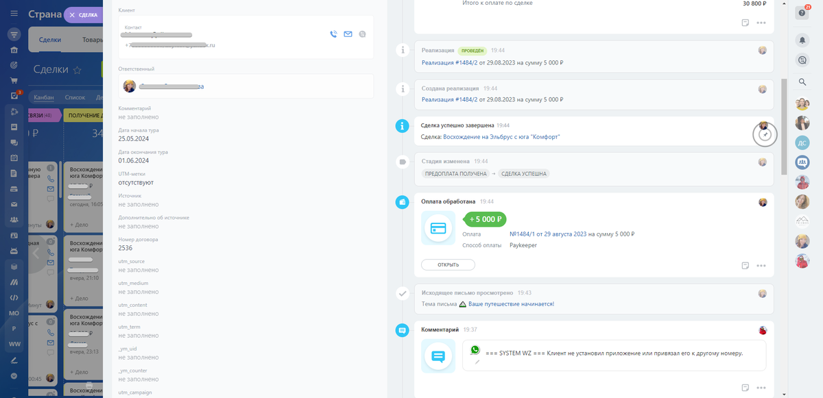 Компания “Страна Ветров” занимается организацией авторских активных туров. Походы, сплавы и восхождения по России и миру, индивидуальные и корпоративные туры по самым разным уголкам России и мира. Необходимость внедрения Битрикс24. С какими задачами пришел клиент Заказчик пришел к нам с уже запущенным ранее Битрикс24. Но требовалась его доработка, для чего и был заключен договор сопровождения с определенным пакетом часов. Что требовалось сделать: Некоторые задачи были уже сформулированы, а некоторые из них появились уже в процессе сотрудничества. Процесс внедрения, особенности проекта Первоначально была проведена встреча с проектной группой заказчика по обсуждению имеющихся задач. После этого запросили необходимую информацию, получили доступы от личных кабинетов интегрируемых сервисов и приступили к реализации. В первую очередь было важно восстановить работу платежного сервиса, чтобы можно было удобно принимать оплату от клиента через ссылку. Но так как без подключения мессенджеров ссы