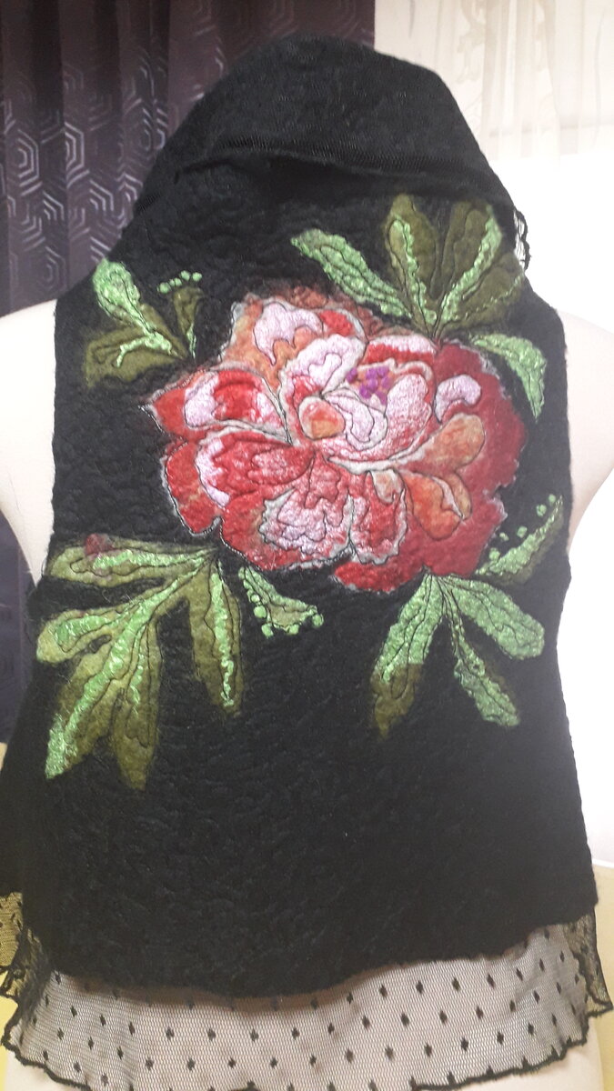 Шерсть, природный и уютный материал, всегда служила источником вдохновения для художников и ремесленников. В одной из самых увлекательных техник работы с шерстью - валянии - изготавливаются разнообразные изделия, включая одежду. Прежде чем приступить к созданию жилета, необходимо подготовить все необходимые материалы и инструменты. Для валяния Вам понадобится шерсть 19-20 микрон черного цвета, а также вискозную бумагу, чтобы сделать аппликацию на спинке жилета. Для комфортной работы выберите удобное место с плоской поверхностью, где вы сможете расстилать шерсть по шаблону. Шаблон – это увеличенная копия оригинала на коэффициент 1,7. Сам жилет – это просто прямоугольник с отверстиями для рук … В готовом виде жилет получился со сторонами 55 см по высоте и 120 см по ширине (это 46-48 р). Жилет застегивается заколкой или булавкой… Жилет армировала фатином в цвет шерсти, т.е. пристегала фатин с изнаночной стороны к шерсти. Фатин выступает за края жилета для красоты. А на спине я сделала апп