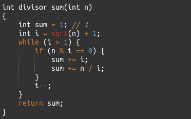 Поэтому с чистой совестью повторю код из прошлых задач. Функция нахождения делителей, а также их суммы: