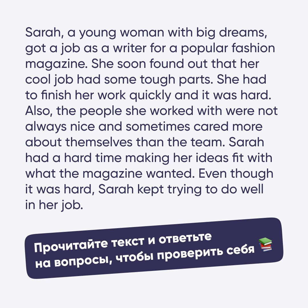 👆Прочитайте текст на картинке выше. А затем в формате теста ответьте на три вопроса, которые помогут понять, насколько хорошо вы поняли прочитанный текст. Это упражнение поможет улучшить навык Reading.