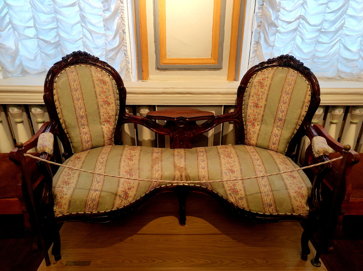 В коллекции Егорьевского историко-художественного музея также представлены предметы мебели. О других предметах экспозиции музея по секциям можно прочесть в отдельных статьях: Мне больше всего запомнились два небольших диванчика на два посадочных места каждый. Места вроде и рядом, но в тоже время отделены друг от друга, соблюдая личное пространство сидящих, при этом спинки немного повернуты друг к другу. Такие диваны получили название «тет-а-тет» или «визави». Такое расположение позволяло оказаться парам в уединении, будучи на виду, что позволяло соблюсти меры приличия того времени, и в свою очередь помогало вести доверительную беседу, флиртовать, назначать свидания. В Россию эта мода на мебель с изогнутым корпусом пришла из Европы в середине 19 века. Первые образцы изготавливались на петербургской мебельной фирме, основанной прусским мастером Генрихом Гамбсом.