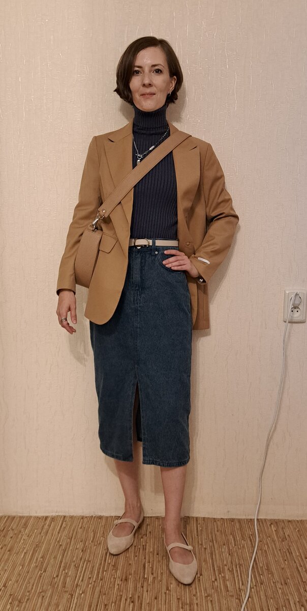 Хороший трикотаж - маст - хэв на холодное время года. И я хочу показать вам несколько идей образов на эту осень с качественными водолазкой и свитерами от Zarina, Aimclo и Evdokia. И ещё здесь поговорим о красивых сочетания цветов. Образ 1. Деним - один из самых модных материалов этого года. И его глубокий синий оттенок отлично сочетается с бежевым. Ещё мне здесь нравится монохромность, которая в первом слое получилась. Вещи в этом образе: - водолазка Zarina. Моя с прошлого года, в этом сезоне есть такие же в разных цветах. Качеством я очень довольна - жакет полушерстяной Selected. Похожие: однобортный, двубортный - юбка джинсовая Zarina. Такой уже нет, вот парочка похожих: 1. Юбка Mark Formelle за 3 107 ₽ (4 199) 2. Юбка Lime за 3 999 ₽. Джинсовые макси, конечно, более модные, но джинсовая юбка длины миди- хорошая база, да ещё и более практичная, особенно осенью. - сумка Arny Praht - балетки Passegiata. Их уже нет в наличии, подобрала похожие: 1. Туфли Gresco за 14 700 2. Туфли Vita