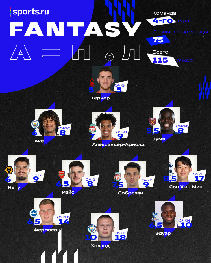 Тур АПЛ перед паузой на сборные – набор вспышек по три мяча. Вместе с теми, кто их забил, мы собрали: • состав – лучшее, что можно было получить в туре, если собирать команду по фэнтези-правилам (общая стоимость – 100, максимум двое из одного клуба, при равенстве очков проходит более дешевый). • это не команда кого-то из реальных игроков и тем более не команда редакции Sports.ru • игроки на картинке расположены не как на тактической схеме, а разделены просто по позициям: на защитников-полузащитников-нападающих. Если присмотреться, можно заметить – это алфавитный порядок слева направо • очки считаем без учета капитана – потому что капитанство уже надстройка, удвоения помешали бы нам четко сравнивать туры и фэнтези-героев. Эрлинг Холанд, «Манчестер Сити» (88,5%) – 18 очков «Манчестер Сити» играл в полсилы, не спеша, и при этом продемонстрировал отличную реализацию: пять голов после семи ударов. А у норвежца три удара и три гола, будничный хет-трик. Было хорошее взаимодействие с Хулианом