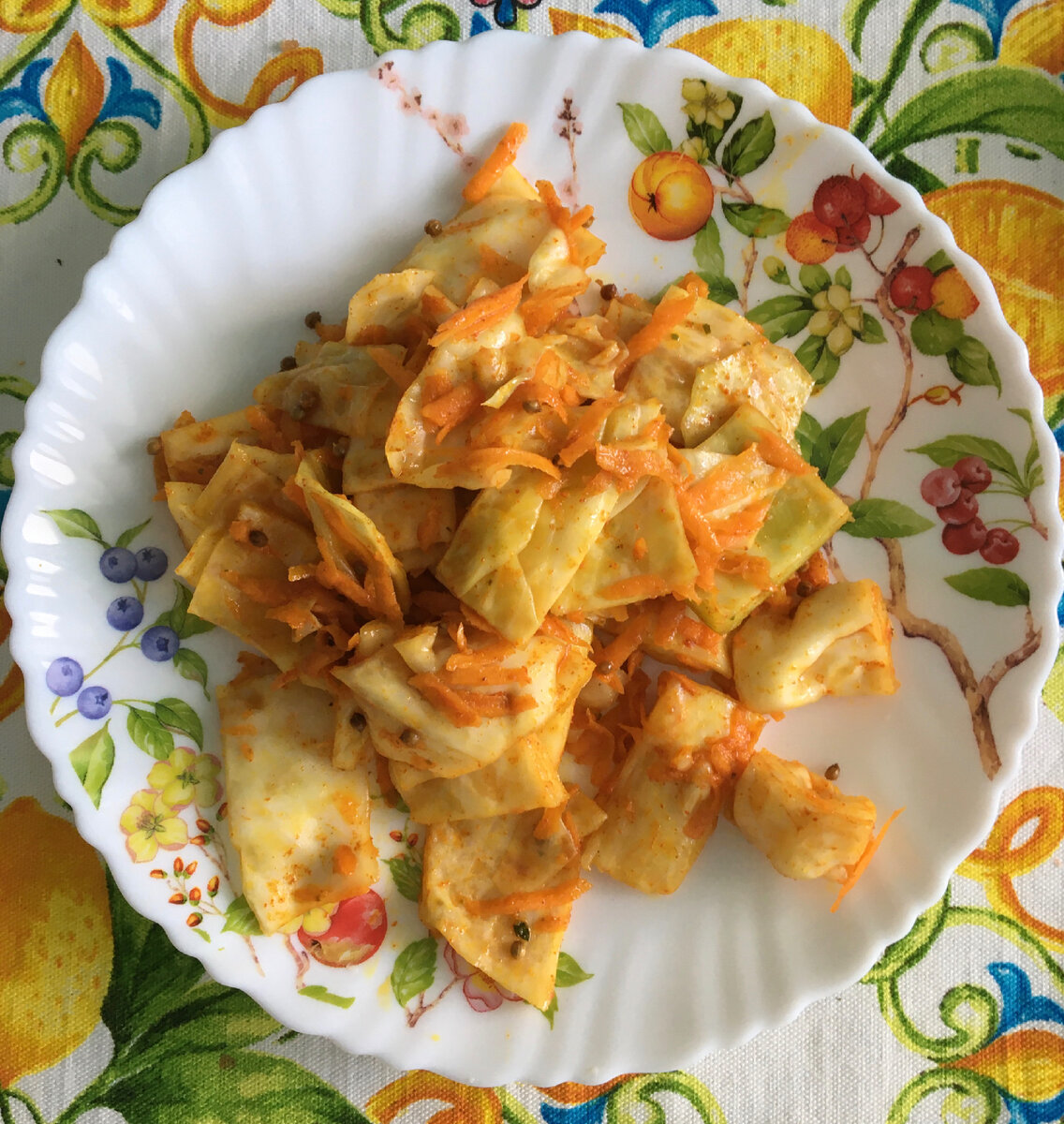 Капуста- 2,5 кг; Морковь- 300 грамм; Растительное масло- 100 грамм. Приправы: Кориандр- 3 чайных ложки; Куркума- 3 чайных ложки; Паприка- 2 чайных ложки; Красный молотый перец- по вкусу. Соль, сахар- по вкусу; Чеснок- 5 зубчиков; Уксус 9%- 3 столовые ложки. Капусту нарезать на крупные квадраты, посолить и оставить на 30 минут. Затем добавить морковь, перемешать, добавить все специи, чеснок и уксус и залить горячим растительным маслом. Все хорошо перемешать и убрать в холодильник. Через пару часов салат готов! @Повар на скорую руку 🧑🍳