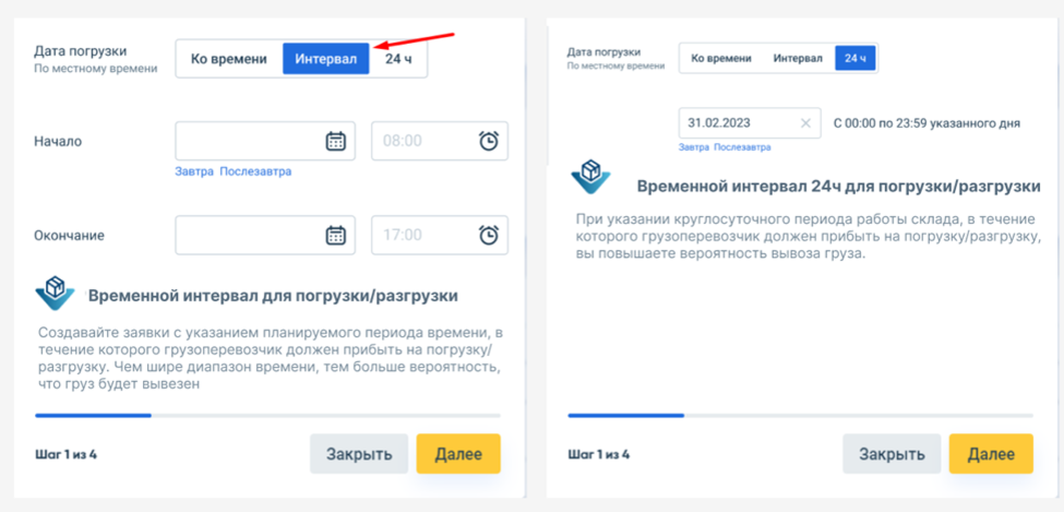 Если выделить время на погрузку/разгрузку в 24-часовом формате, достаточно указать только дату и применить выбор. Перевозчик, принявший заявку, направит водителя в удобное для себя время в течение суток.