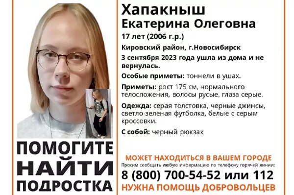 В Кировском районе Новосибирска 3 сентября пропала 17-летняя Екатерина Хапакныш. Она вышла из дома и ушла в неизвестном направлении, после чего на связь она не выходила, а о её местоположении информации нет. «На горячую линию отряда поступила заявка о пропаже девушки. 03 сентября этого года вышла из дома и до настоящего времени не вернулась. Начат информационный поиск, идет активное распределение ориентировки в сети», — рассказала НДН.инфо представитель поисково-спасательного отряда «ЛизаАлерт» Ольга Бобкова. Приметы: рост 175 см, нормальное телосложение, русые волосы и серые глаза. Была одета: серая толстовка, черные джинсы и светло-зеленая футболка, а также белые с серым кроссовки. Вместе с собой у неё был черный рюкзак. Если вам что-либо известно о местонахождении пропавшей, сообщите по телефону горячей линии отряда 8-800-700-54-52 (круглосуточно, бесплатно) или 112. Дмитрий Кузнецов
