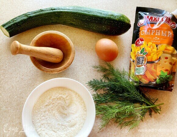 укроп свежий - 3веточка Шаг: 1 Подготовьте необходимые ингредиенты. Для рецепта лучше использовать небольшой, молодой цукини. Шаг: 2 Цукини помойте, обрежьте хвостики и натрите на крупной терке вместе с кожурой. Уложите натертый цукини в миску, посолите и дайте постоять 10 минут. Затем хорошо (прям сильно) отожмите цукини от лишней жидкости. Шаг: 3 Добавьте к цукини яйцо, муку, мелко рубленный укроп, ложку с горкой сырного соуса ТМ «Махеевъ», поперчите и