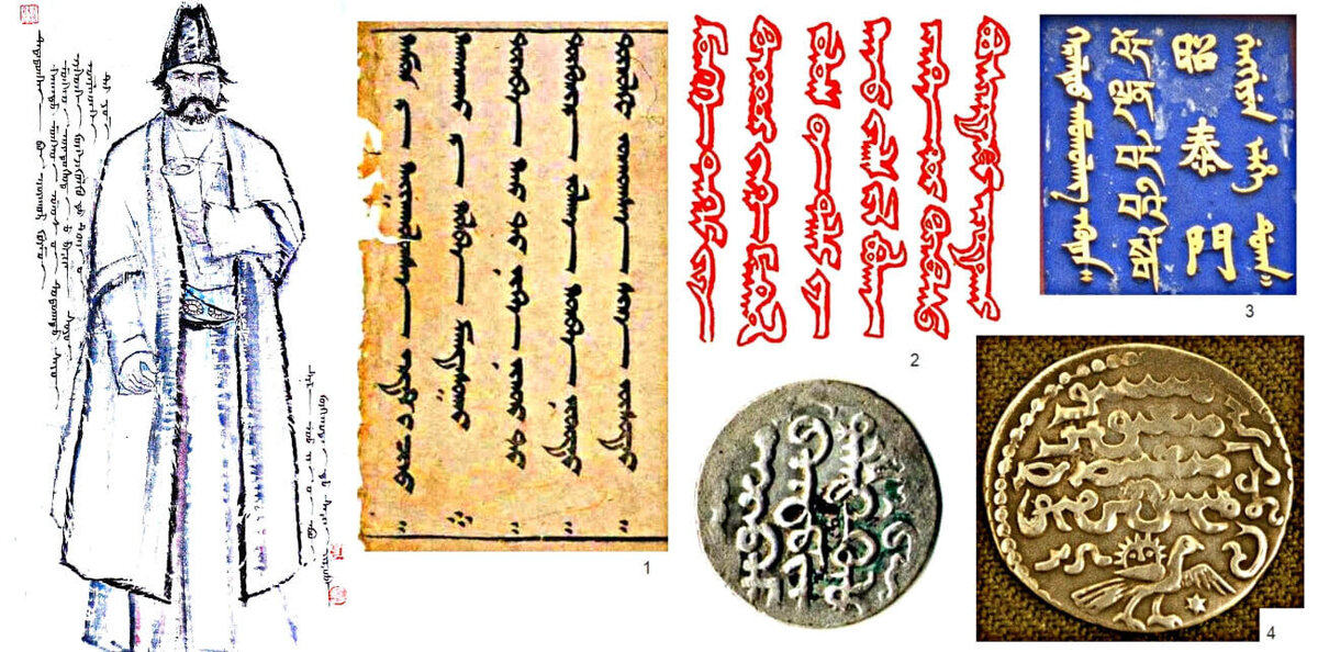 Слева Тататунга, справа 1 – Старинный образец монгольского письма 13 века; 2 – Императорская печать Гуюк-хана в письме Папе Иннокентию IV, 1246 г.; 3 – четырехъязычная (монголо-тибето-китайско-маньчжурская) надпись на вывеске тибетского буддийского храма Юнхэгун в Пекине, подаренная императором Цяньлуном; 4 – слева: монета времен правления ильхана Байду, 1295 г.; справа: серебряный дирхам времён правления ильхана Аргуна, 1297 г.